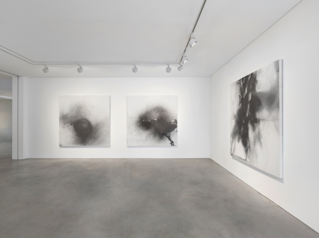 The front room of K1 is dedicated to five works titled Signal, each drawing made in collaboration with nature. While most museums and art institutions strictly regulate humidity as a means to preserve objects, Porras-Kim actively incorporates this element into her process to generate spontaneous “signals.” Produced in various locations around the world since 2021, each Signal is created from a work known as Forecasting Signal (2021–ongoing), which uses a suspended fabric soaked with graphite and an industrial dehumidifier that collects and releases moisture from the interior environment for the duration of an exhibition. The moisture drips through the fabric, forming patterns on panels placed on the gallery floor. The resulting works reflect environmental factors—including climate, season, and visitor traffic—while also capturing the invisible vitality of the exhibition space in abstract forms.
