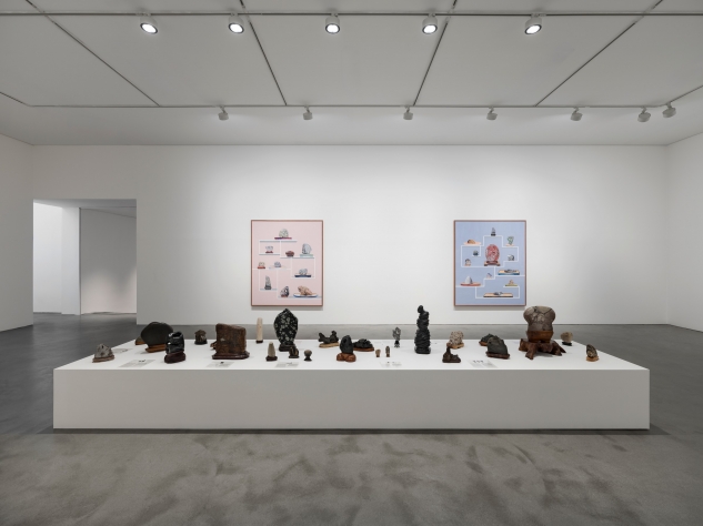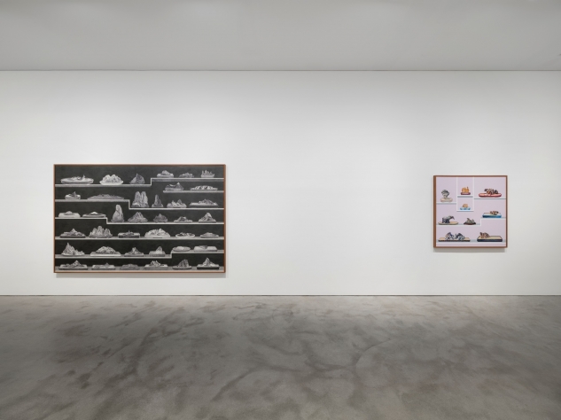 In the exhibition, the artist presents a series of new, non-traditional categories and groupings such as “balanced stones,” “extraterrestrial stones,” “sacred stones,” and “animal-shaped stones.” The works bring together images of existing stone formations, reimagined in the shape and scale of personal collections, to highlight the ways we see and appreciate each stone’s distinctive features. The series continues what Porras-Kim refers to as “index drawings,” which work through ideas of organizing structures that shape contemporary interpretations of historical artifacts. The format for these drawings is inspired by chaekgeori, a Korean genre of still life that depicts stacks of books, valuable items, and scholarly accoutrements—a form of display which she re-employs as a means to draw attention toward objects and how their meaning is shaped through collecting practices. This series takes the form of meticulous drawings, and the method of their construction encourages the artist and viewers to slow the gaze and observe the distinctive details of each object.