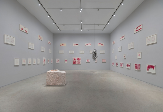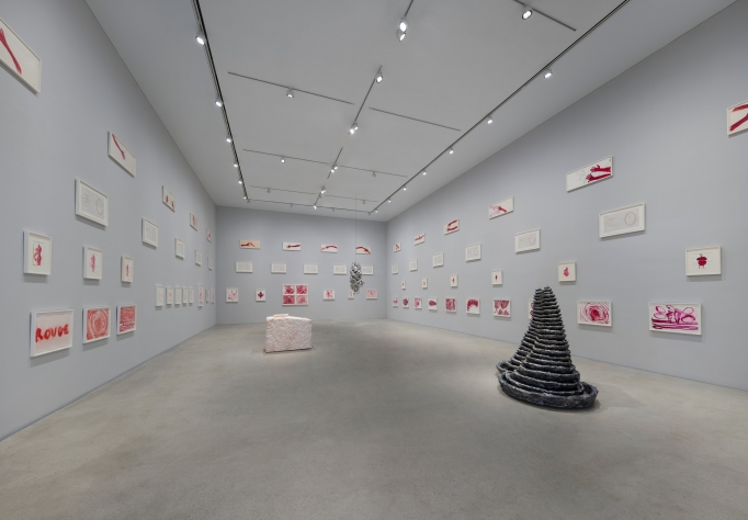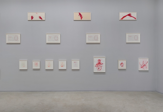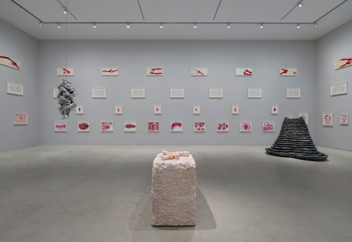 In K3, fabric suites and works on paper have been wrapped around the four walls of the room to create an immersive environment. The suite 10 AM Is When You Come To Me (2006) scores the moments of Bourgeois’s working relationship with her longtime assistant Jerry Gorovoy through variations of their hands in red gouache. The fabric suite Hours of the Day (2006), in which a clock face for every hour is paired with excerpts from her writings, offers a philosophical meditation on time, memory, and emotion. The lower portion of the walls is hung with a selection of late gouaches and watercolors foregrounding the motifs that preoccupied Bourgeois in her later years: the self-portrait, the couple, the mother and child, the good mother, the family, the landscape, and the spiral.