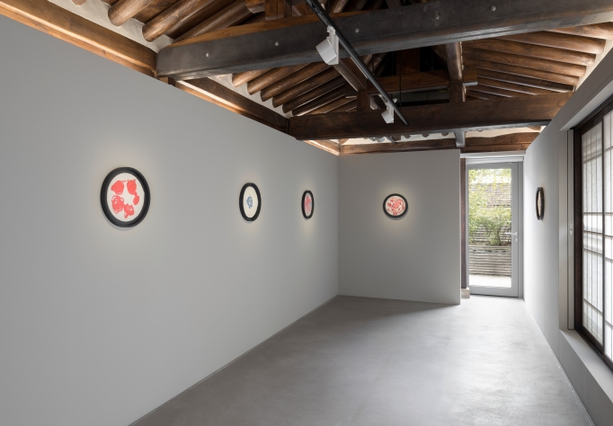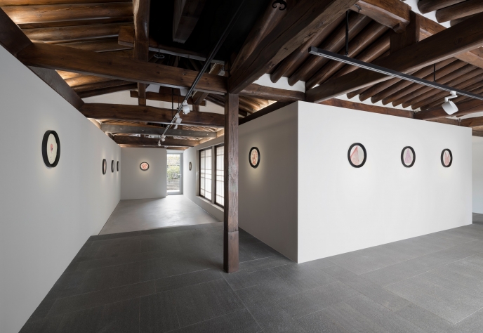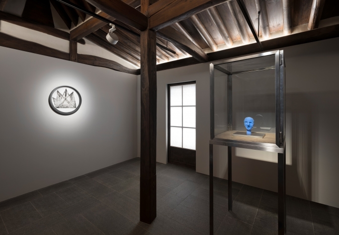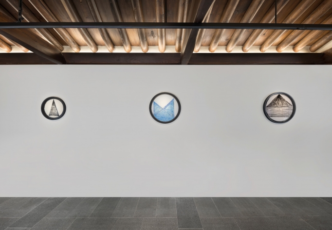 The Hanok space features a series of drawings on coffee filters made by Bourgeois in 1994 and exhibited here for only the second time. These compositions are unusual for Bourgeois in having a circular format, which may have unconsciously suggested to the artist the face of a clock. As so often in Bourgeois’s work, the prevailing iconography hovers between abstract and organic—biomorphic shapes and stains that suggest the natural world and sometimes even landscapes; and sharp-edged geometric forms and a graphic quality that in some ways anticipate the fabric drawings of the 2000s, in which circular compositions radiate outwards from their centers to intersect with other circles. The use of an everyday, domestic coffee filter as drawing paper imbues these intimate works with a diaristic and experimental feel.