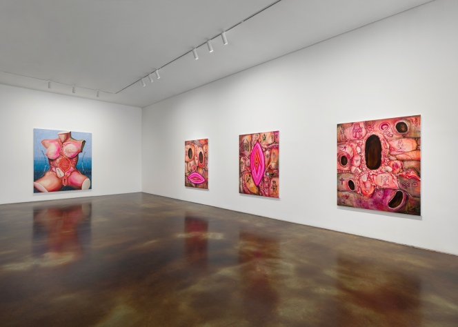 Gore Deco seeks to recover the perspective elided by the traditional hierarchies inherent in the medium of painting. By bringing forward subordinated subjects and adopting new visual strategies, the exhibition expands the diversity and fluidity of contemporary pictorial language. This is an attempt to at once explore the possibilities of painting through alienated physical experiences and the historically marginalized idioms of decoration, as well as to reconfigure the boundaries of the medium. While the artist’s incorporation of art history, history of visual culture, and bodily materials associated with women may seem to convey resistance laced with improvisational humor and sarcasm, this ultimately attests to the artist’s powerful gaze and sincerity towards painting.