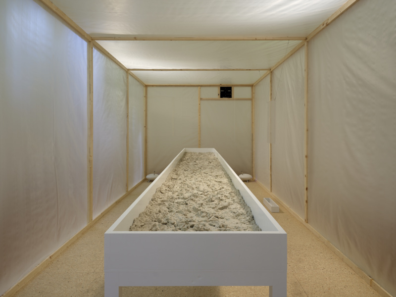 At the center of the exhibition was the installation The motion of an alluvial record, an “atmospheric pavilion” composed of living matter including clay, sediment, and silt collected from the wetlands of the Yucatán Peninsula, placed in conditions of high humidity and heat that reflect the Mayan concept of cyclical time. By artificially recreating a tropical climate within a freestanding wood-and-glass module, the work disrupts conventional museum climate concepts, which typically strive for a controlled, dry environment. Instead, it exposes how environmental control itself reshapes the meaning of objects. The installation also incorporated material traces embedded with institutional histories—such as ash from the fire at the National Museum of Brazil and dust gathered from the Peabody Museum in the United States—highlighting museums not as neutral repositories of knowledge, but as contested sites where multiple narratives intersect.
