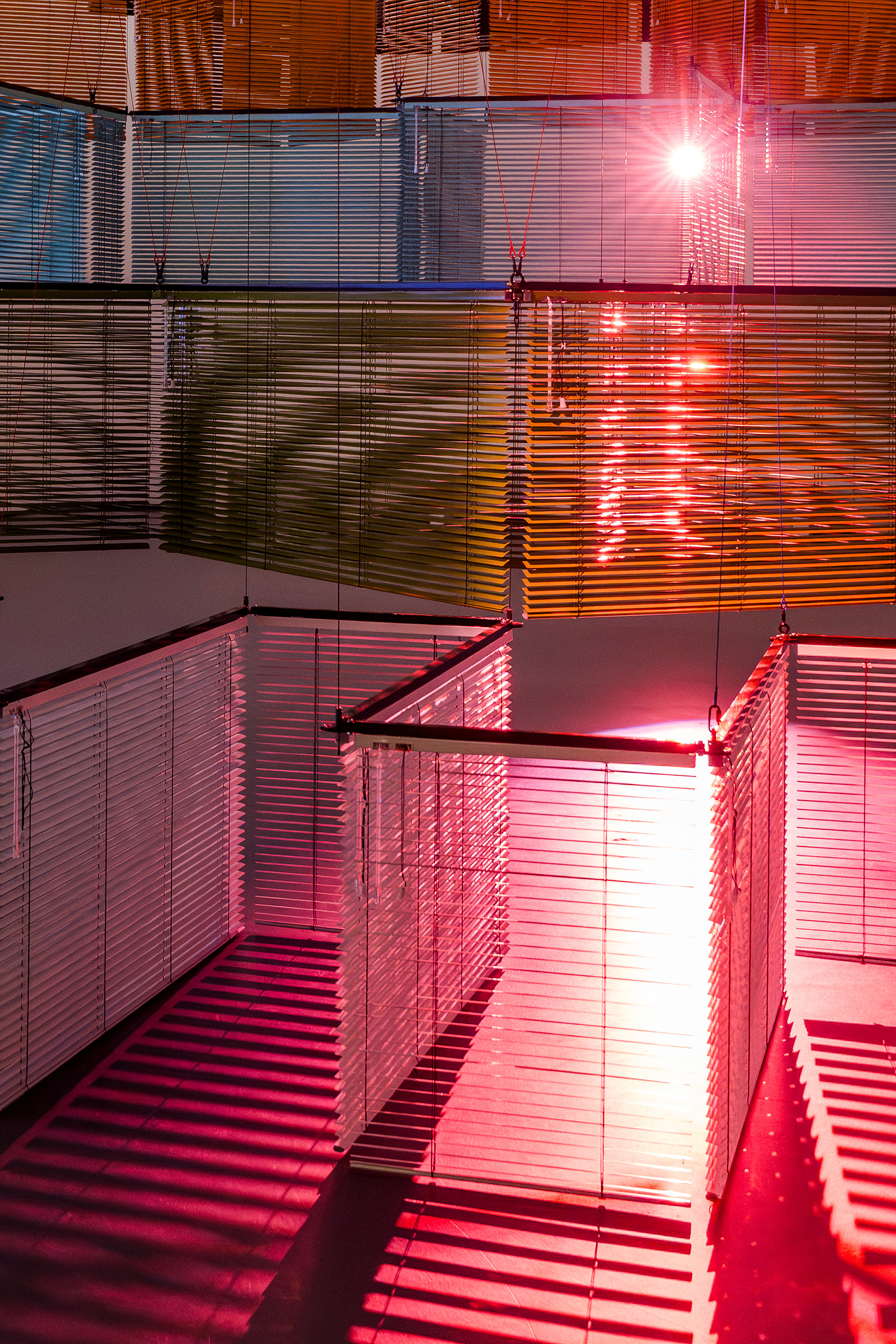 This juxtaposition of two markedly different works executed in the same material—Venetian blinds—demonstrates Yang’s continued interest in asymmetry. Presented as disparate parallels, these iconic works foreground her sustained engagement with doubling, materializing an exploration of intercontextuality between the two pieces.