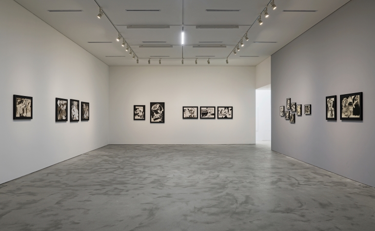 The first of the two adjacent gallery spaces in the K1 building showcases Choi’s signature use of color and abstraction as well as her innovative approach to collage, while the latter focuses on her black and white ink drawings. The first room exhibits a body of small paintings that serve as an extension of the diverse experimentation the artist undertook with the formal characteristics of black and white mediums. Initiated when she was a student at the Cranbrook Academy of Art, Choi’s abstract paintings powerfully illustrate her unique approach to expressionistic gestures and line employing oil paint and acrylic, in addition to charcoal, conté, oil pastel, and ink. While this body of paintings clearly evokes Willem de Kooning’s incisive brushwork and Robert Motherwell's abstract yet meditative pictorial planes, the collages, exhibited in tandem with the paintings, display the influence of pop art. For the artist, incorporating newspaper clippings and other media allowed for a direct response to the pressing social issues at the time; in this way, Choi engaged with the methodology of combine paintings which incorporated everyday objects affixed to the canvas. These two discrete but related bodies of work demonstrate the artist's strong commitment to personal expression and social commentary through brave exploration of form and content, and how she chose her own path instead of blindly following or adhering to a single artistic movement.