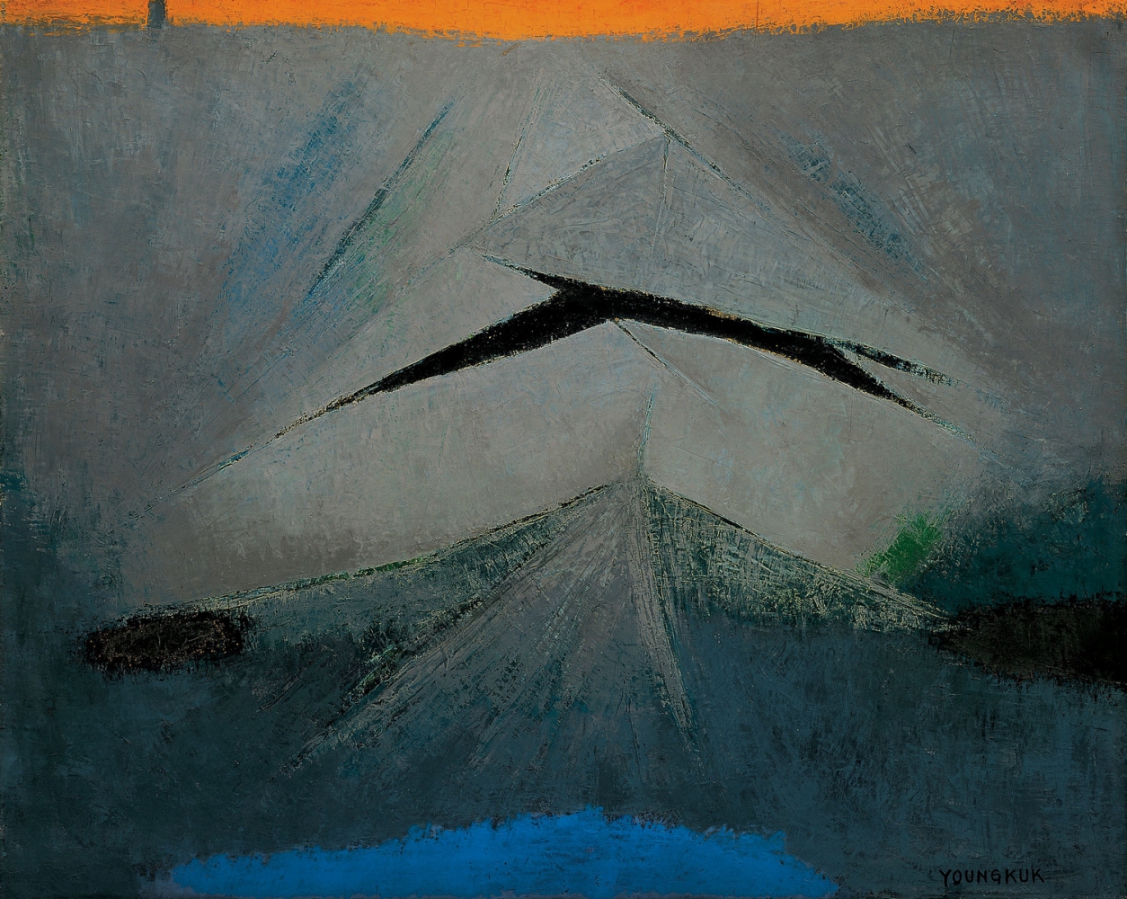 In 1964, at the age of forty-eight, Yoo ceased his group activities and affiliations entirely, devoting his time and attention solely to his studio practice as a full-time artist. The vast body of drawings and large-scale abstract paintings completed during this period, depicting Yoo’s signature mountain motif, capture the innermost depths of his mind and keen perception of landscape. Noteworthy for their profound level of focus and energy, and an even stronger and more incisive command of composition and style, the profusion of these new works suggests that the artist was struggling to make up for his last twenty years which he referred to as “the lost period.” After his first solo exhibition in 1964, Yoo Youngkuk began to broaden his artistic oeuvre with meticulously calculated compositions and colors, adopting a process wherein he gradually applied colors one atop another to create thick layers. During this period, Yoo’s craft shifted conspicuously from amorphous abstraction to a focus on geometry, along with a more diversified palette including ultramarine, green, purple, and black based on the three primary colors of red, blue, and yellow. Like the afterimage of an intense color lingering even after closing one’s eyes, the lasting moments evoked by Yoo Youngkuk’s colors of emergence elicit both the tension and harmony of complementary colors, as well as the depth and synesthesia caused by subtle variation. Through this masterful use of color, Yoo's works from this period achieve a kind of aesthetic zenith, as defined by his desire for the absolute. For Yoo, this pursuit reflected his philosophical commitment to the idea of life as a full-time artist, an ideal he associated with pursuing an abstinent life, a persistent will and consistent formal experimentation, the pursuit of aesthetic catharsis, and the path he himself took as an explorer, endlessly contemplating the basic elements of form in order to delve into the origin and essence of the abstract.
