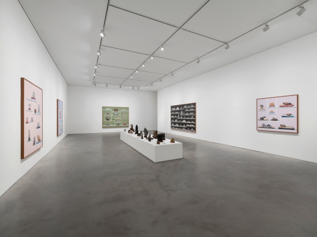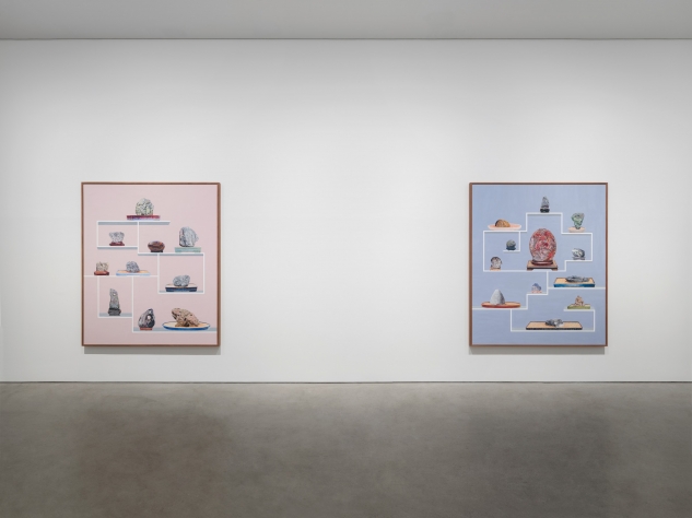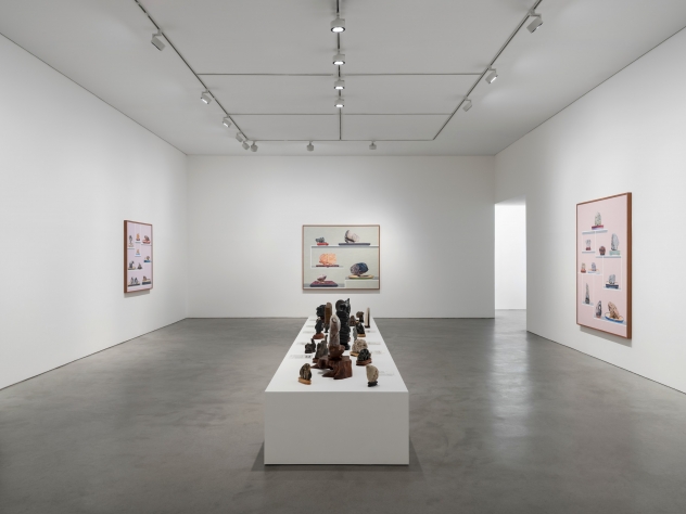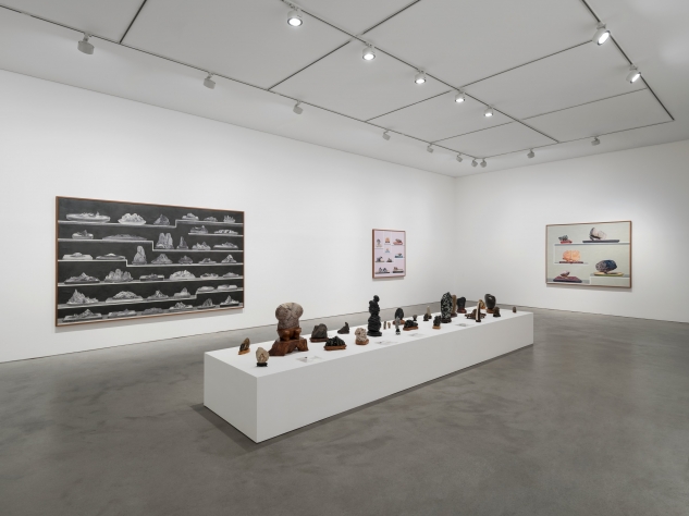 In the exhibition, the artist presents a series of new, non-traditional categories and groupings such as “balanced stones,” “extraterrestrial stones,” “sacred stones,” and “animal-shaped stones.” The works bring together images of existing stone formations, reimagined in the shape and scale of personal collections, to highlight the ways we see and appreciate each stone’s distinctive features. The series continues what Porras-Kim refers to as “index drawings,” which work through ideas of organizing structures that shape contemporary interpretations of historical artifacts. The format for these drawings is inspired by chaekgeori, a Korean genre of still life that depicts stacks of books, valuable items, and scholarly accoutrements—a form of display which she re-employs as a means to draw attention toward objects and how their meaning is shaped through collecting practices. This series takes the form of meticulous drawings, and the method of their construction encourages the artist and viewers to slow the gaze and observe the distinctive details of each object.