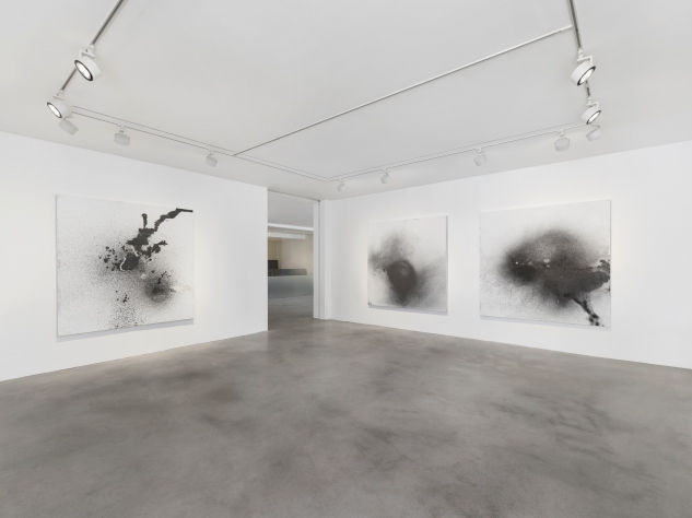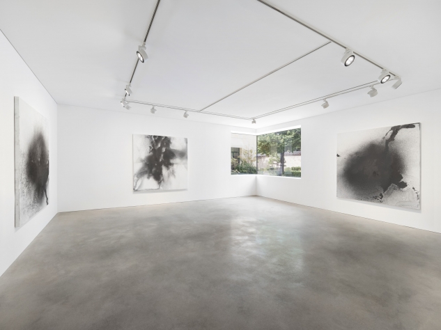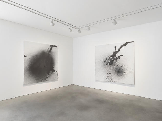 The front room of K1 is dedicated to five works titled Signal, each drawing made in collaboration with nature. While most museums and art institutions strictly regulate humidity as a means to preserve objects, Porras-Kim actively incorporates this element into her process to generate spontaneous “signals.” Produced in various locations around the world since 2021, each Signal is created from a work known as Forecasting Signal (2021–ongoing), which uses a suspended fabric soaked with graphite and an industrial dehumidifier that collects and releases moisture from the interior environment for the duration of an exhibition. The moisture drips through the fabric, forming patterns on panels placed on the gallery floor. The resulting works reflect environmental factors—including climate, season, and visitor traffic—while also capturing the invisible vitality of the exhibition space in abstract forms.