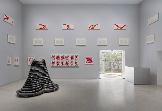 The Hanok space features a series of drawings on coffee filters made by Bourgeois in 1994 and exhibited here for only the second time. These compositions are unusual for Bourgeois in having a circular format, which may have unconsciously suggested to the artist the face of a clock. As so often in Bourgeois’s work, the prevailing iconography hovers between abstract and organic—biomorphic shapes and stains that suggest the natural world and sometimes even landscapes; and sharp-edged geometric forms and a graphic quality that in some ways anticipate the fabric drawings of the 2000s, in which circular compositions radiate outwards from their centers to intersect with other circles. The use of an everyday, domestic coffee filter as drawing paper imbues these intimate works with a diaristic and experimental feel.