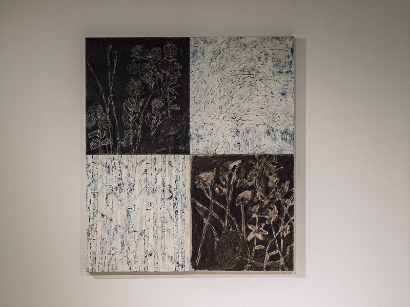 “Intermission” introduced both artists together, presenting brief information and interview footage on their practices shaped by different times and environments. Gimhongsok’s Four Gracious Plants-231234 (2023) is an experimental work that dismantles the border between East and West. Using Western materials such as acrylic paint and modeling paste, the artist paints the Four Gracious Plants (plum blossom, orchid, chrysanthemum, bamboo; 梅蘭菊竹), which was long regarded as symbols of the virtuous man in East Asian culture. Not only does he reconstruct these motifs to blur the distinction between East and West, but he also attributes authorship to a fictional artist named “Kosnoh Mig” (an anagram from his own name). Grounded in his critical perspective from the periphery rather than the center of art, Gimhongsok fluidly repositions the subject of creation.